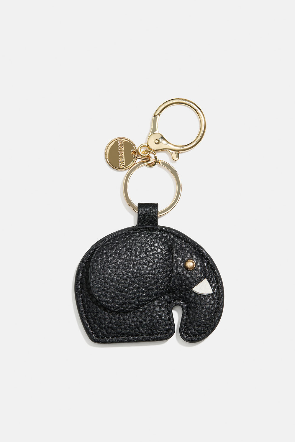 Nyckelring med elefant i svart imitationsläder. Går att fästa med nyckelring och klolås.