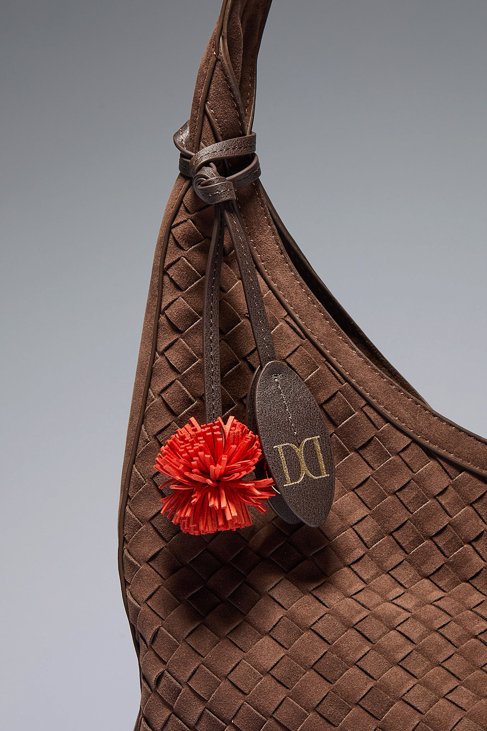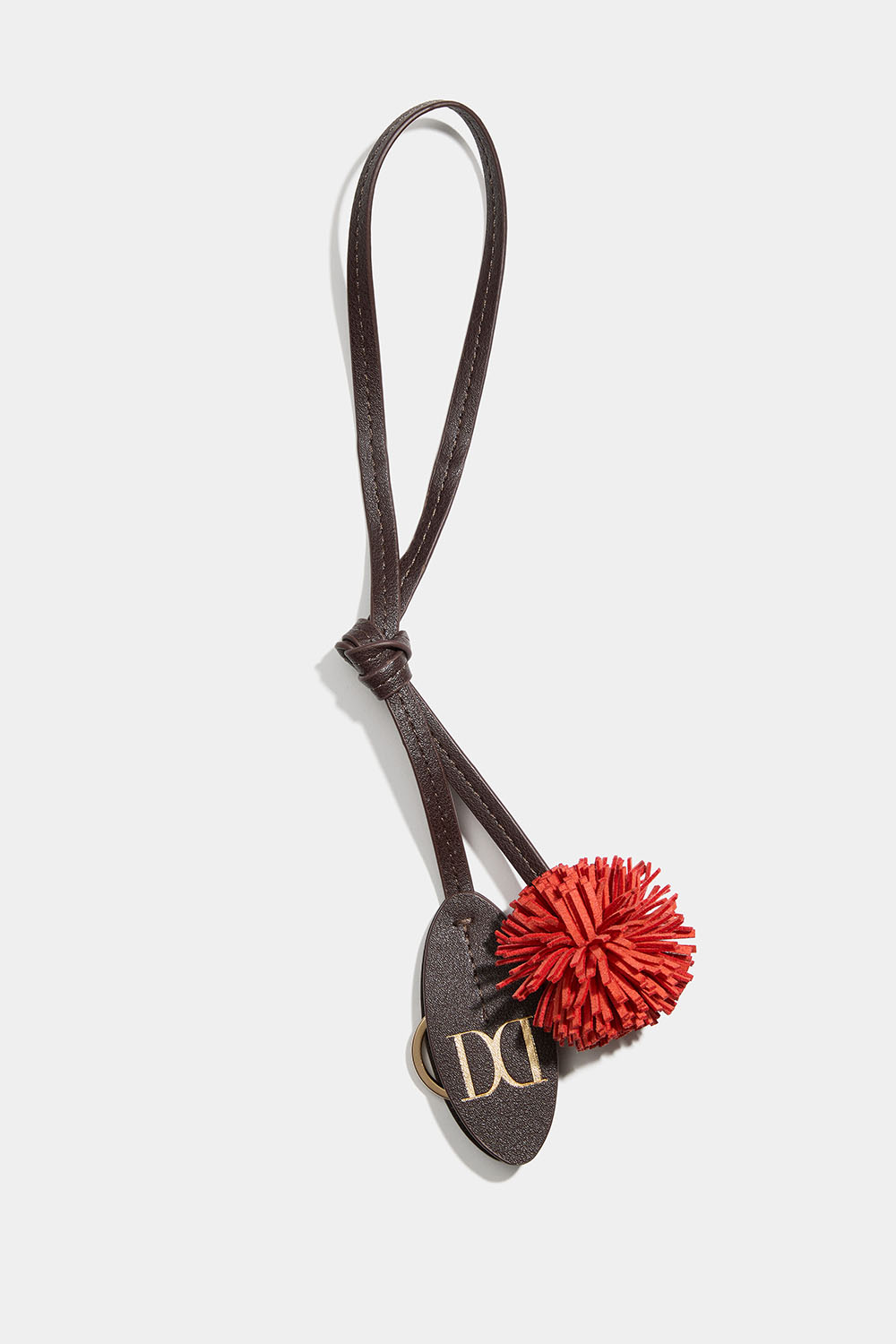 Väskdekoration med röd pompom i imitationsläder och en nyckelring i bladform med guldfärgad DD logga.