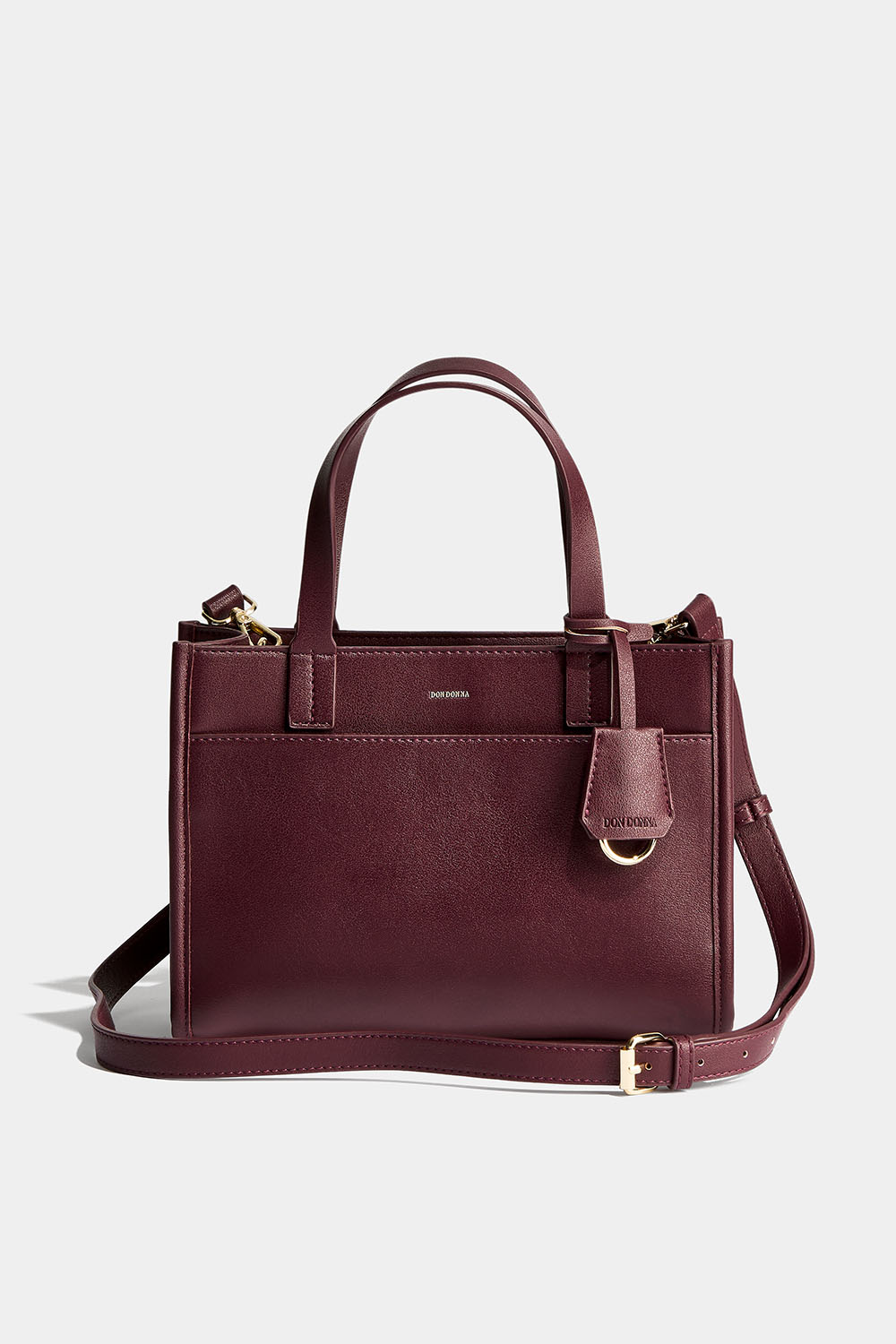 Vinröd väska med guldfärgad Don Donna-logga framtill. Väskan har två handtag och en avtagbar axelrem. Väskan har ett större fack som stängs med dragkedja och två mindre fack inuti. Axelremmen är avtagbar och justerbar, så att man även kan bära väskan som
