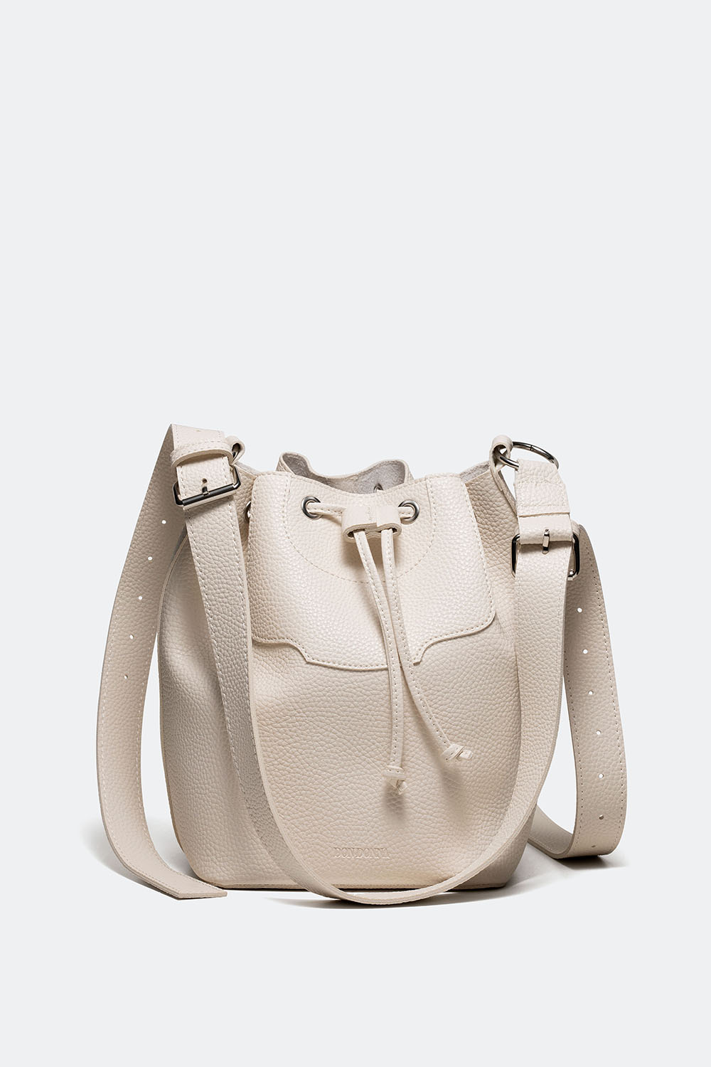Vit väska i bucket bag design med Don Donna-loggan präglad framtill. Stor väska som kombinerar mode med funktion och har ett stort fack och ett mindre fack framtill som försluts med en magnetisk knapp. Kommer med justerbar axelrem.