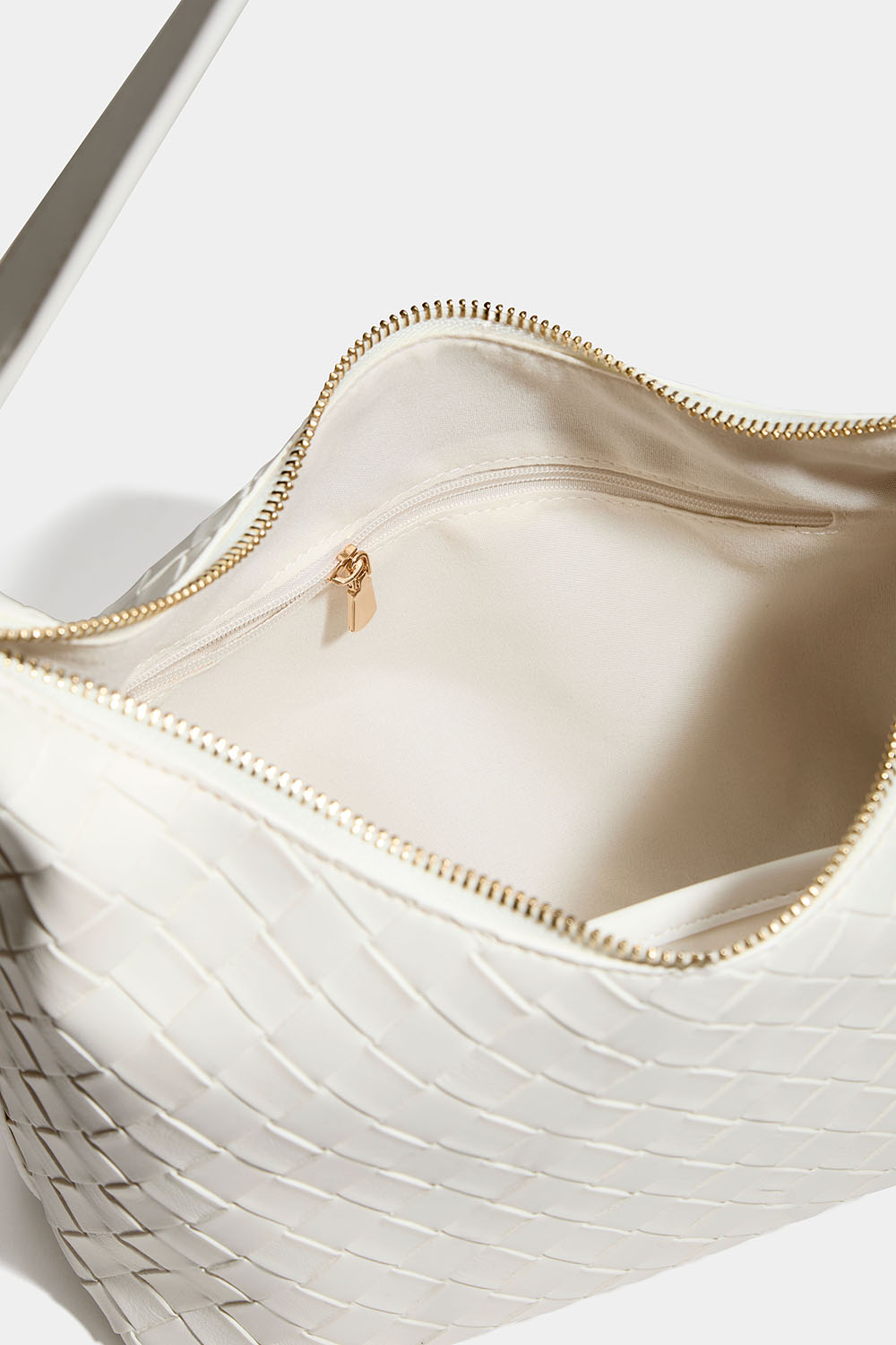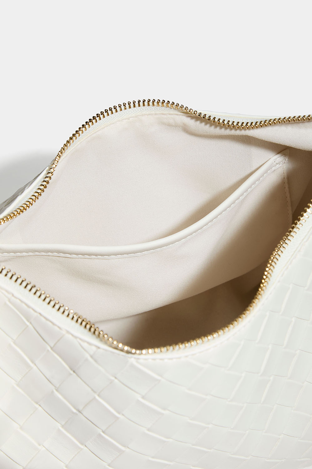 Vit handväska i flätad textur. Väskan har ett stort fack och två mindre på insidan, varav en har stängning med dragkedja.