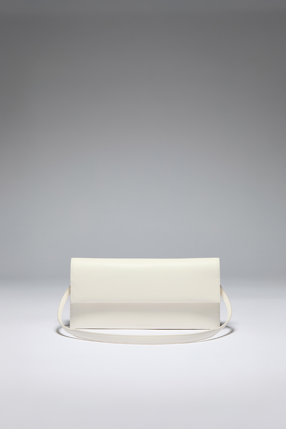 Vit kuvertväska i imitationsläder med en präglad liten Don Donna logga. Väskan stängs med magnet och har tre fack på insidan, en som stängs med dragkedja. Det medföljer en avtagbar axelrem.