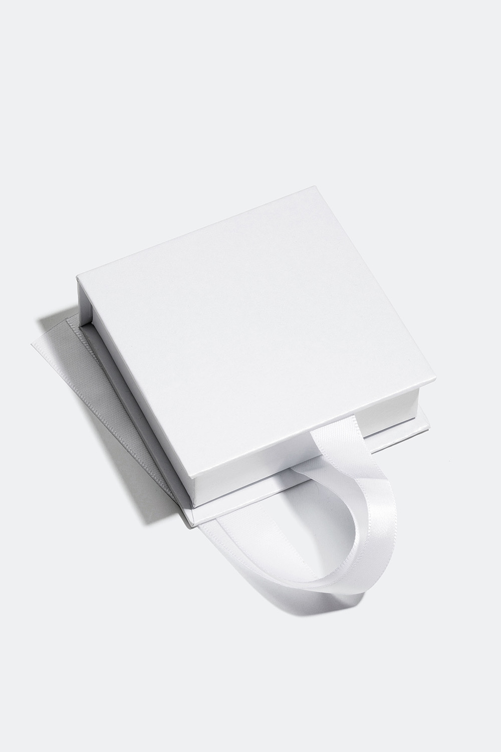 En fyrkantig presentask i vit kartong med lätt skimrig yta och tillhörande sidenband som både stänger asken och är en fin detalj. Innuti finns en kudde som du kan fästa örhängen, ring och halsband. Perfekt ask för att ge bort smycken i present till flera olika tillfällen så som jul, födelsedag, morsdag och examen.