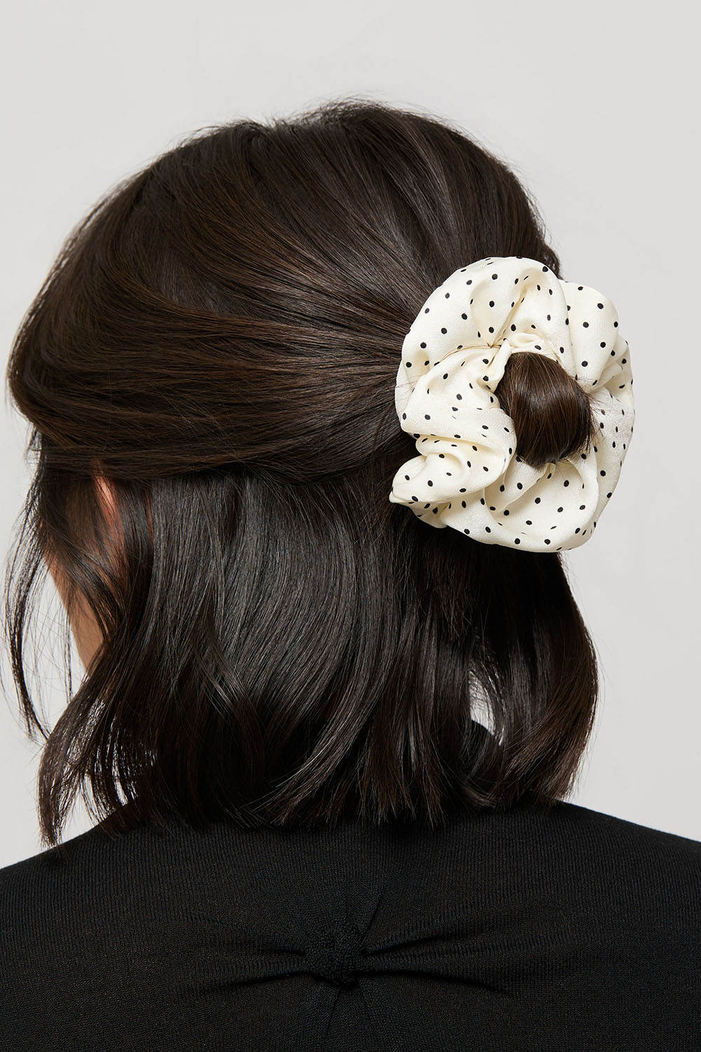 Scrunchie i vit sidenimitation med små svarta prickar.