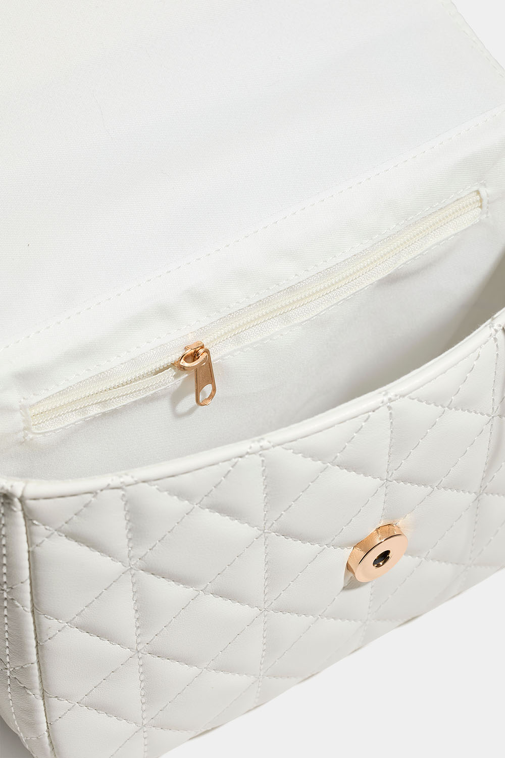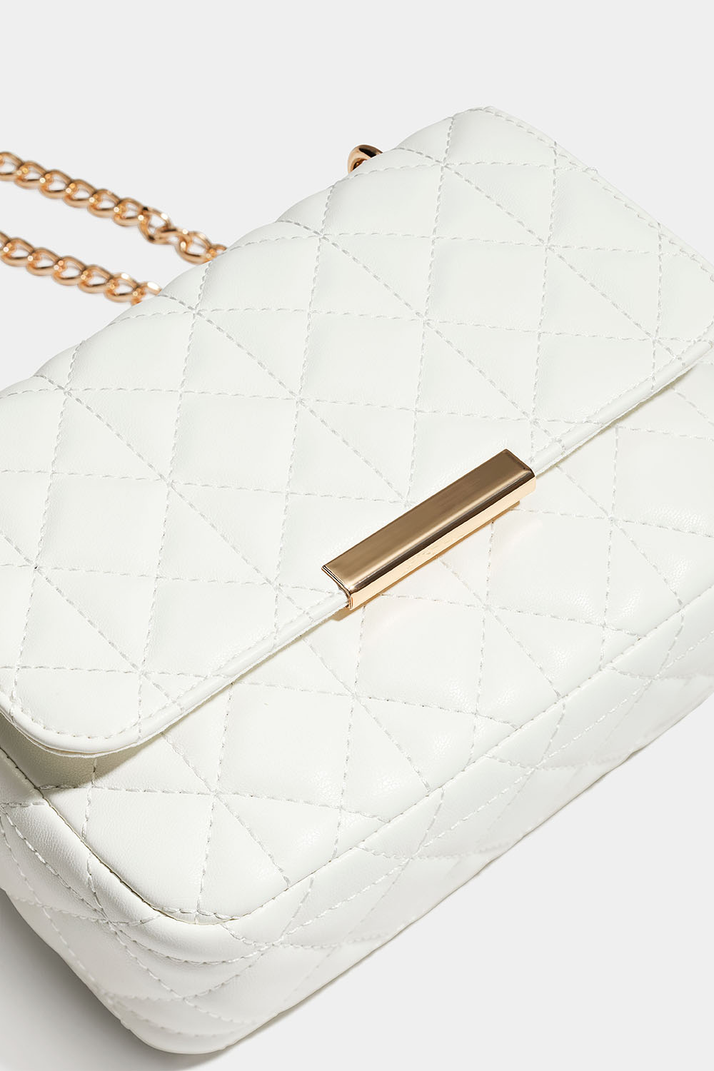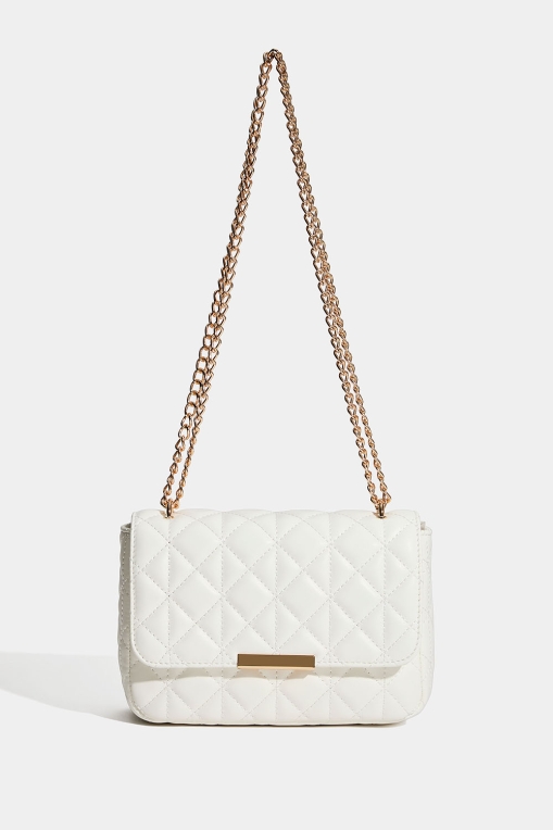 Vit väska med quiltad design och guldfärgad axelrem med kedja. Man kan antingen bära kedjan dubbelt för kortare axelrem, samt som längre och då kan väskan även bäras crossbody. Väskan stängs med en magnetknapp och har ett litet innerfack som stängs med dragkedja.
