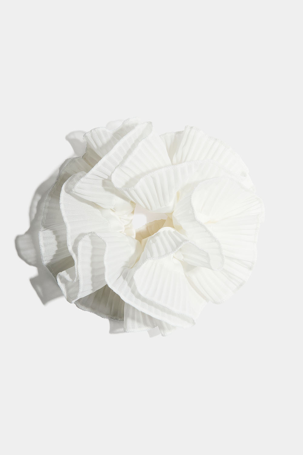 Stor vit scrunchie med vit sidenimitation och plisserad tyll med sydda kantar.
