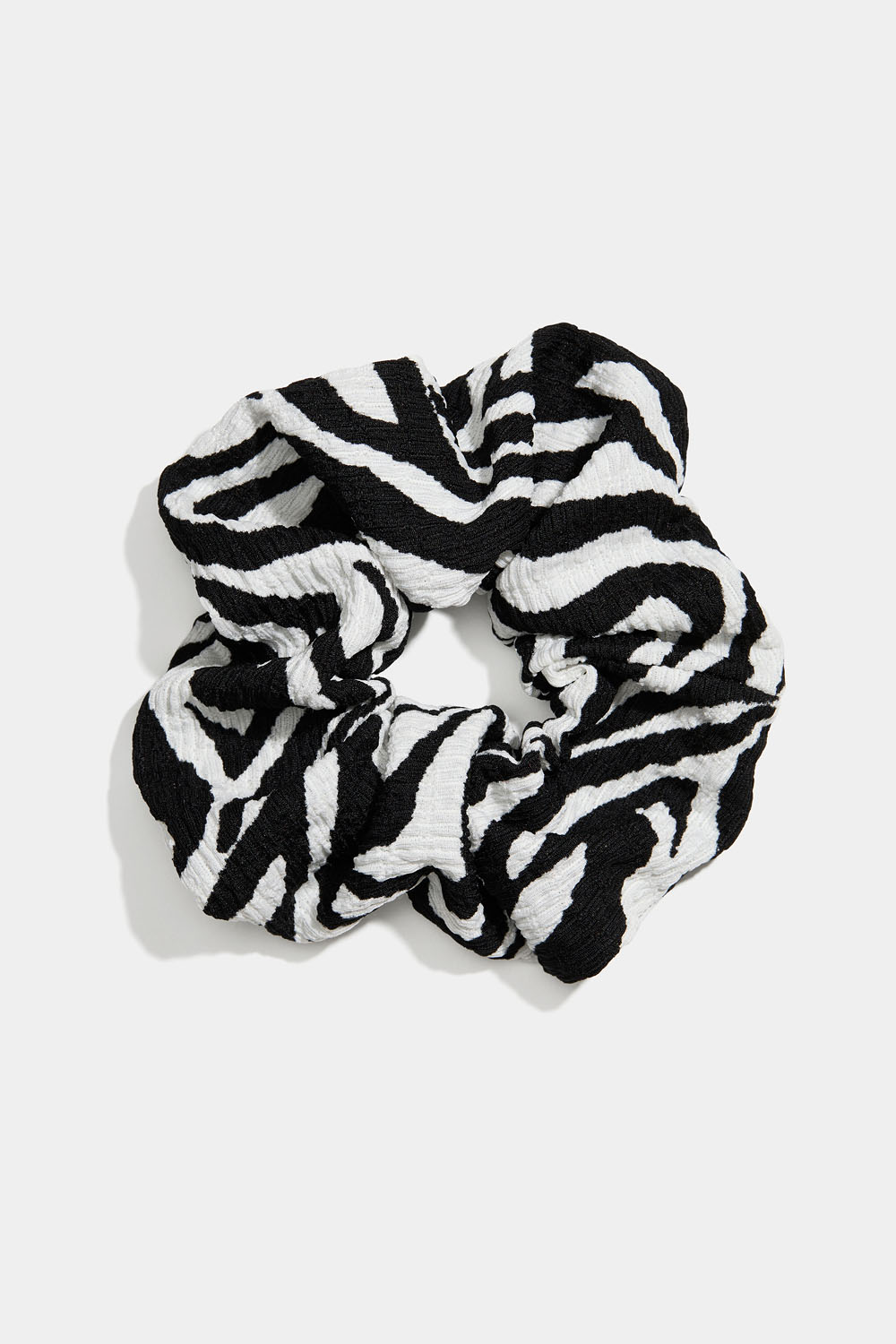 Zebra-mönstrad scrunchie i tyg med struktur.